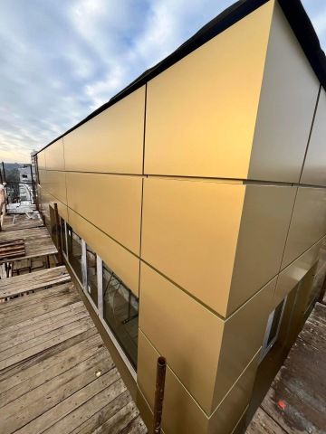 Popis zakázky: Realizovali jsme výrobu a montáž opláštění horní části budovy za použití zlatého bondu. Tento materiál nejen zajišťuje moderní a elegantní vzhled, ale také dlouhou životnost a odolnost.